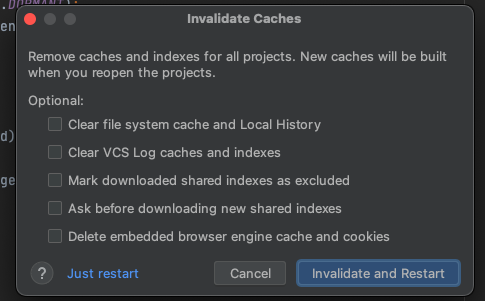 인텔리제이 2022.03 버전 기준 위의 Invalidate Cache를 선택하게 되면 아래와같이 옵션을 선택할 수 있으며 Invalidate and Restart를 클릭함으로 최종적으로 캐시가 정리된다.