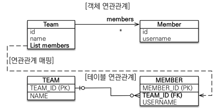 - Member 엔티티에는 외래 키를 매핑할 수 있는 참조 필드가 없다.