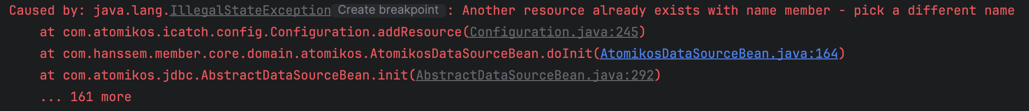 로컬에서도 마찬가지로 테스트가 깨지고 있었고 로그에서는 아래와 같이 Atomikos 에러가 출력