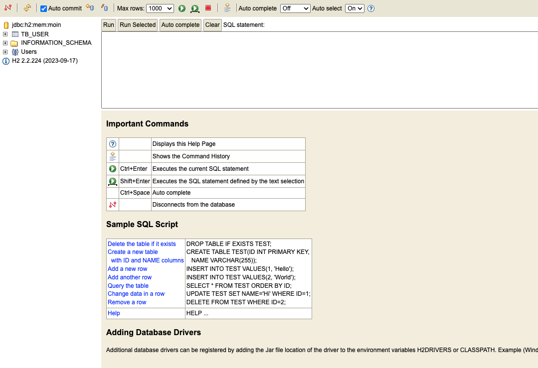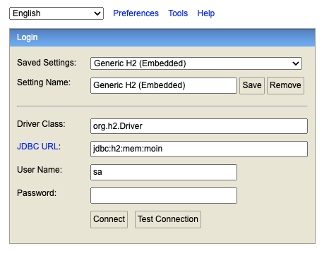 H2는 기본적으로 sa라는 사용자 이름과 빈값을 패스워드 기본값으로 사용한다.