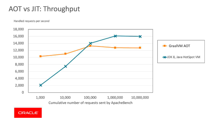 AOT 컴파일러로 생성된 네이티브 이미지는 초기 JIT 컴파일러에 비해 훨씬 뛰어난 성능을 보인다. 이는 네이티브 이미지는 JIT 컴파일러와 비교하여 기계어로 번역되는 그 시점에 바로 최적화가 진행되기 때문이다. 하지만 시간이 지나고 요청이 지속적으로 처리 될수록 JIT 컴파일러가 더욱 뛰어난 성능을 보이게 되는데, 이는 애플리케이션을 실행하며 얻어낸 실행 환경 정보를 바탕으로 더욱 합리적인 최적화를 진행하기 때문이다. 즉 기존 JIT 컴파일러 생성 파일은 초기 실행은 느리지만 웜업(WarmUp) 과정을 거치면서 AOT 컴파일러에 비해 더욱 안정적인 성능 보인다.