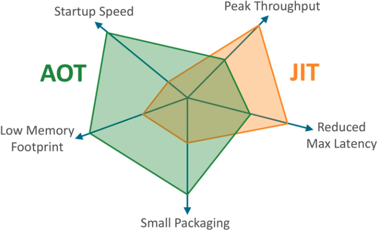 미리 컴파일된 네이티비 실행 파일은 즉시 시작되며 최고의 성능으로 실행하기 위해 웜업이 필요하지 않다.